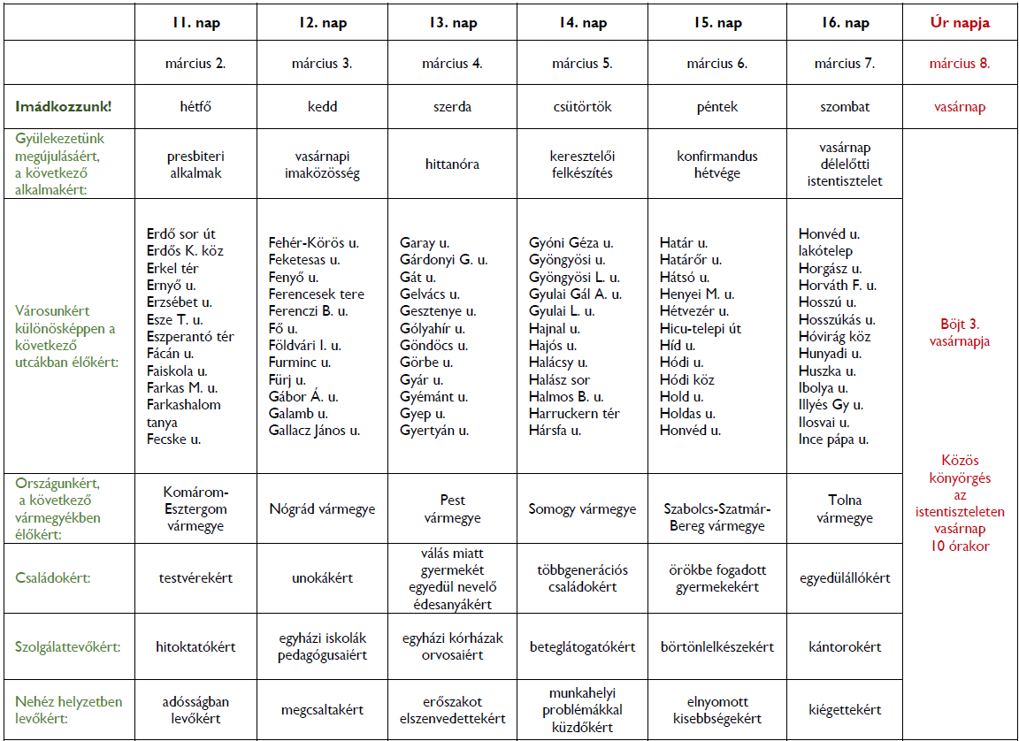 Gyülekezeti böjti imanaptár Adminisztrátor2026-03-01T18:53:11+01:002026. március 1.|Egyéb| Gyülekezeti böjti imanaptár bejegyzéshez a hozzászólások lehetősége kikapcsolva Köszönjük, ha megosztja másokkal is ezt az információt! FacebookTwitterLinkedInGoogle+PinterestEmail A szerzőről: Adminisztrátor Related Posts Ökumenikus világimanap Gallery Ökumenikus világimanap 2026 az Imádság éve – Kálvin imája – Bűnvalló imádság és vallástétel Gallery 2026 az Imádság éve – Kálvin imája – Bűnvalló imádság és vallástétel Vasárnapi üzenet – János 12,37-43 Gallery Vasárnapi üzenet – János 12,37-43 Gyülekezeti böjti imanaptár Gyülekezeti böjti imanaptár Házasság hete Gallery Házasság hete